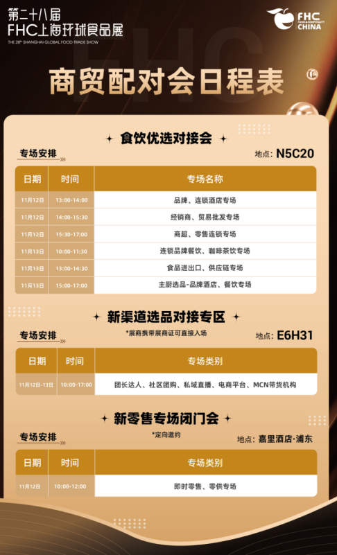 FHC组委会提前调研参展品牌的市场需求,定向邀约来自山姆、永辉、京东超市等头部零售平台的采购负责人到场,并设置:品牌、连锁酒店专场,经销商、贸易批发专场,商超、零售连锁专场,连锁品牌餐饮、咖啡茶饮专场,食品进出口、供应链专场,主厨选品-品牌酒店、餐饮专场,以及新渠道选品对接专区,涵盖社区团购、直播电商、MCN带货机构等新兴零售渠道,提升选品效率和精准度。